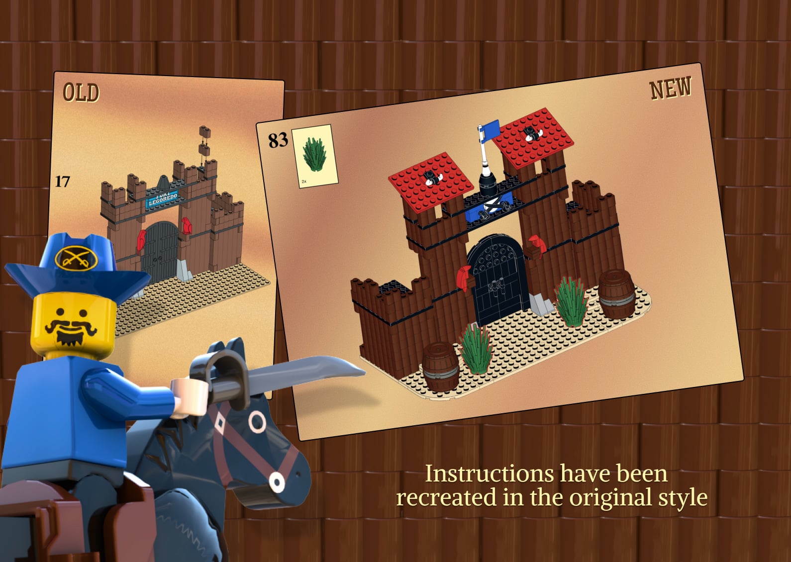 Includes brick-built versions of the fort signs, barrels, parrots, rock parts and doors using current elements.Old-timey instructions