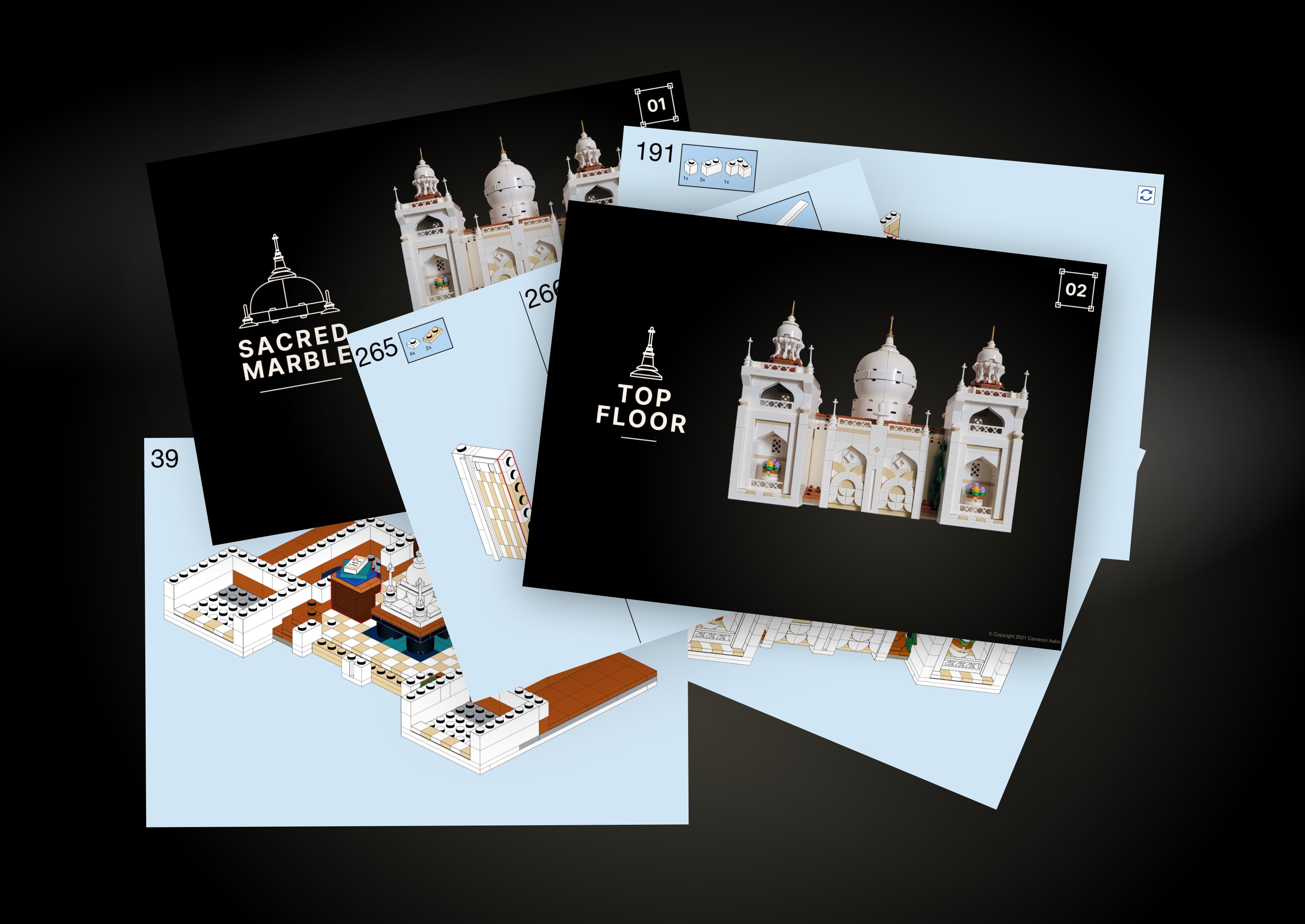 Digital instructions to create a modular version of the iconic Taj Mahal, featuring ivory-white architecture and an ornate tiled interior.